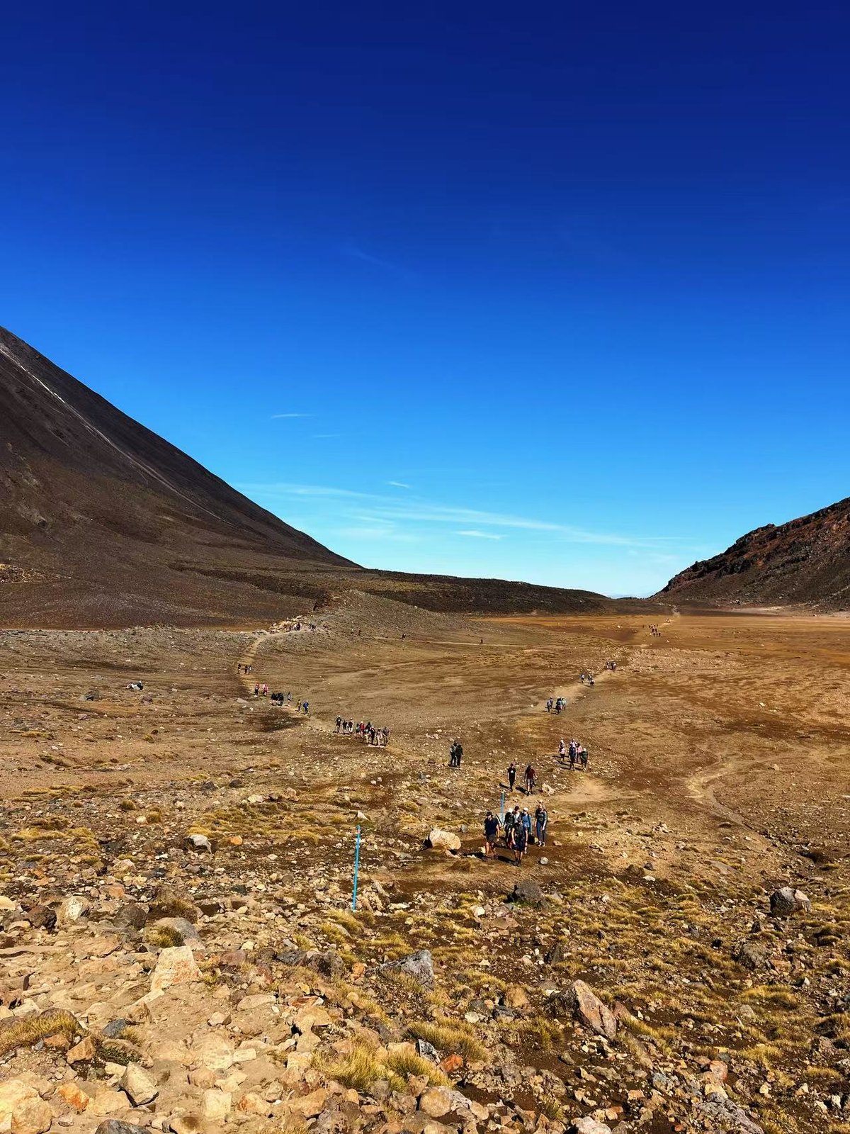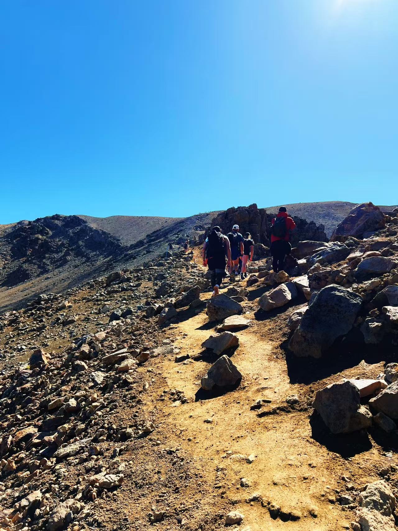 Mangatepopo Carpark 的空氣清冽而寒冷,我們整理好裝備,深吸一口氣,邁出了第一步。前段的路相對平緩,是覆蓋灰黑火山石的荒原。遠處的 Mount Ngauruhoe 錐形完美,海拔 2287 米,紅褐色岩壁在晨光下泛著微光,仿佛岩漿仍在其中翻滾。風呼嘯著捲起塵土,腳步在碎石間發出沙沙的回響。朋友輕聲說:「你不覺得這像是在走向命運嗎?」我笑著回答:「也許 Frodo 就是走過這樣的路。」