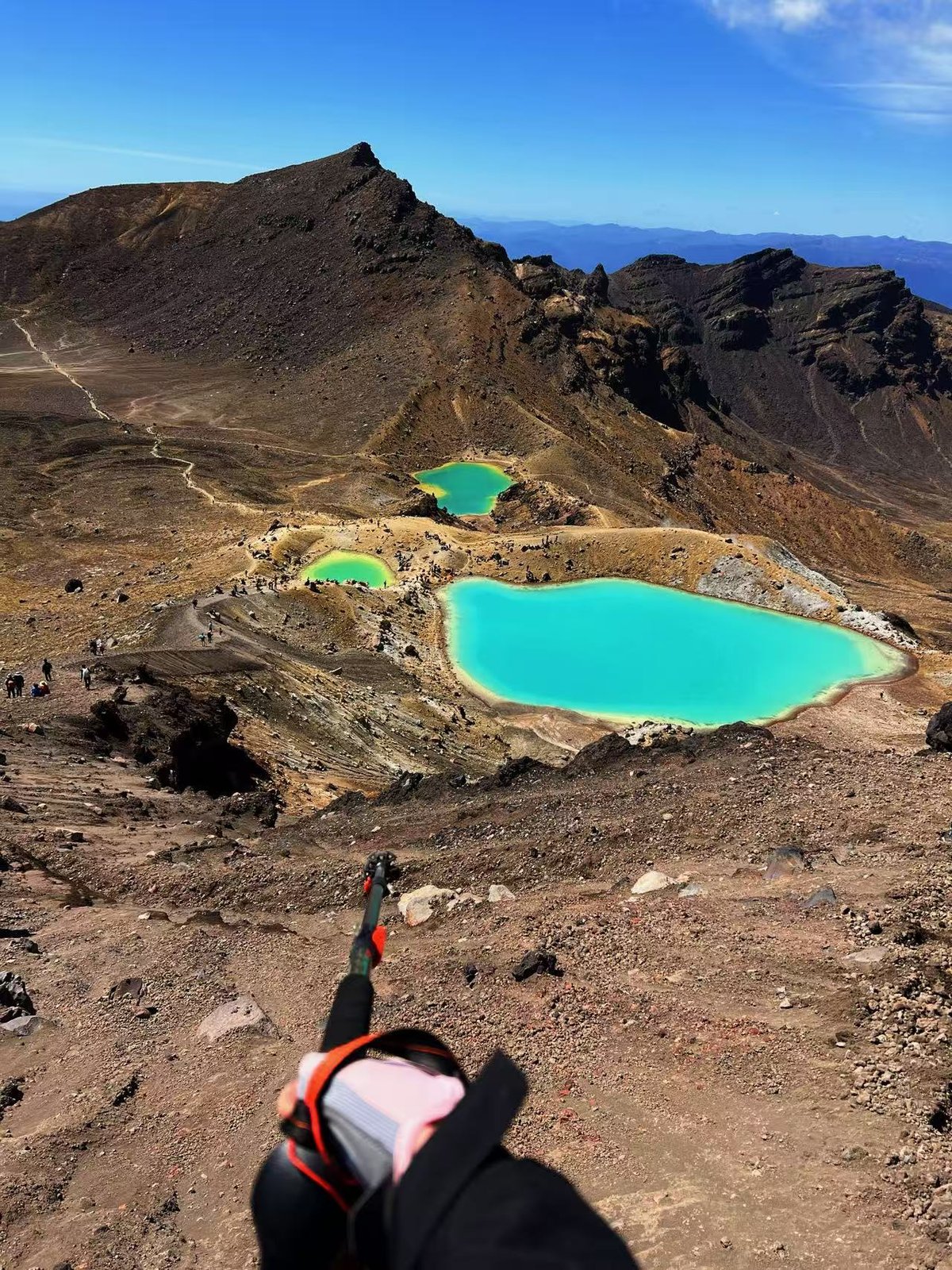 繼續攀登,我們到達了紅色火山口 Red Crater,風幾乎把人吹倒。紅色的火山壁深不見底,火山氣孔裡冒出的白煙夾著硫磺味,讓人既敬畏又著迷。向前望去,一片綠色從荒涼中跳出來——那就是 Emerald Lakes(翡翠湖)。碧綠的湖泊像荒漠裡的寶石,靜靜點綴在通往「魔多」的路上,仿佛在提醒旅人,即使前方艱難,依然存在生命的光亮。湖水的酸性高達 pH 2,但在陽光下折射出純淨的綠光,每一瞬都讓人屏息凝神,像是在荒漠中發現了隱藏的寶藏。