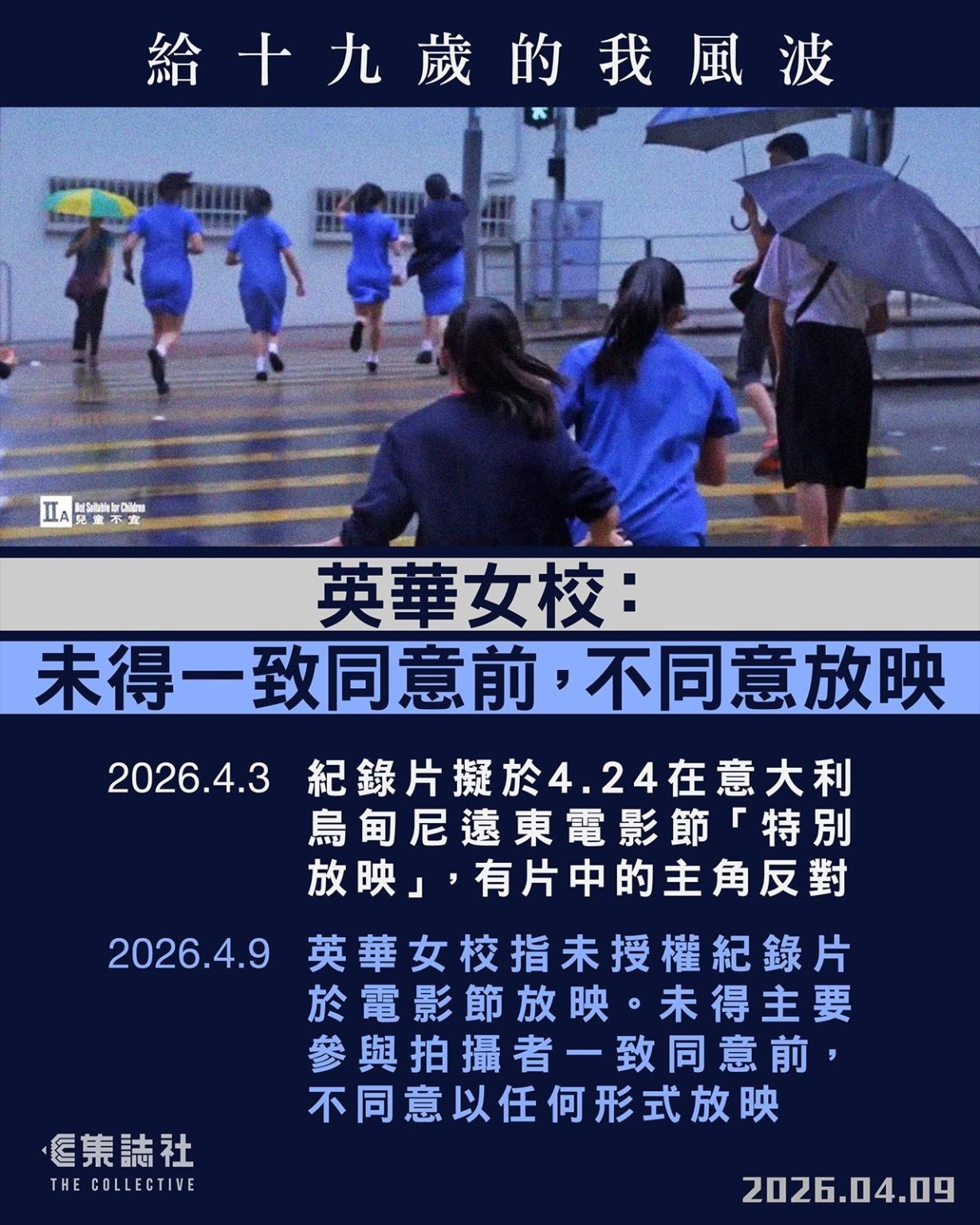 張婉婷團隊的言論值得注視,他們在公開信中自言三年來保持緘默,飽受精神壓力,為尊重學校,為片中同學不受輿論干擾,「啞忍了三年」,直斥英華女校「講大話」(說謊),他們「非常震驚」,「不是我們認識的英華女校,或是任何教育家的所為」。當初啞忍,方今反擊,彷彿一肚怨氣無處宣洩,久煉成精。某夜月黑風高,妖氣爆發。如斯言論,顧影好像宮怨連綿,對校方又似連番掌摑。箇中暴怒,躍然紙上。