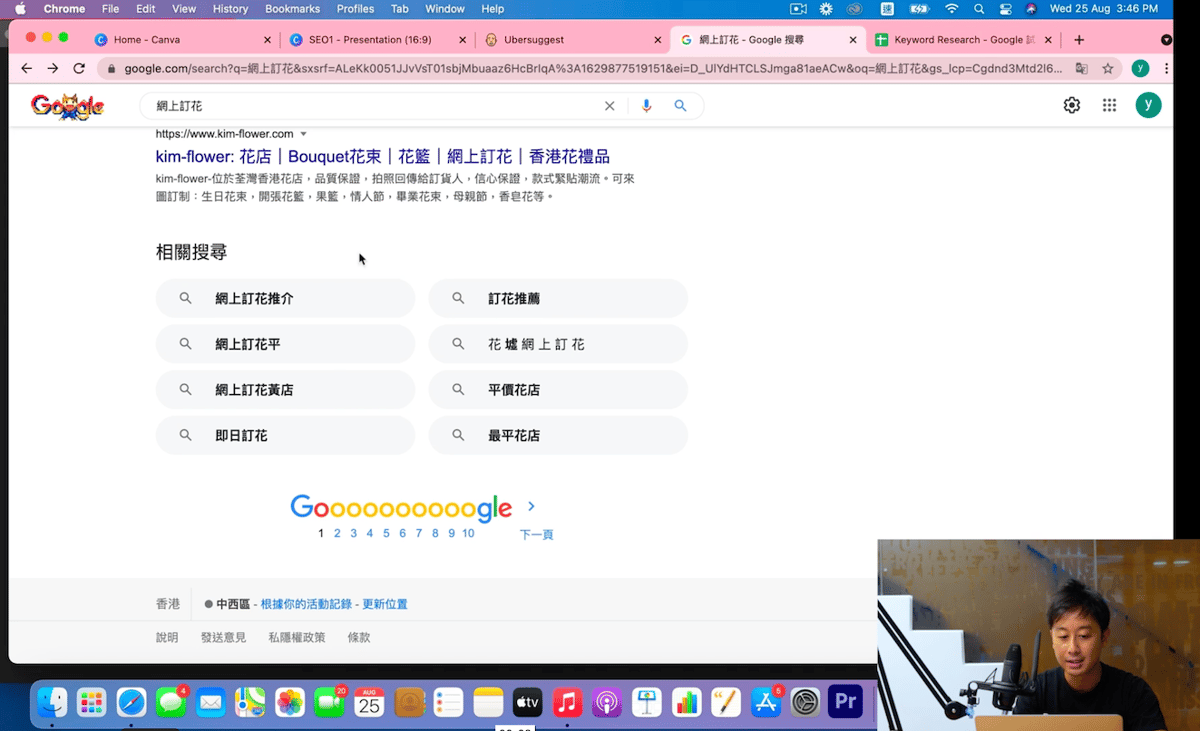 只要Google搜尋「賣花」,你就會見到很多相關的關鍵字彈出來。然後再嘗試搜尋「花店」,又會出現花店相關的關鍵字建議。
