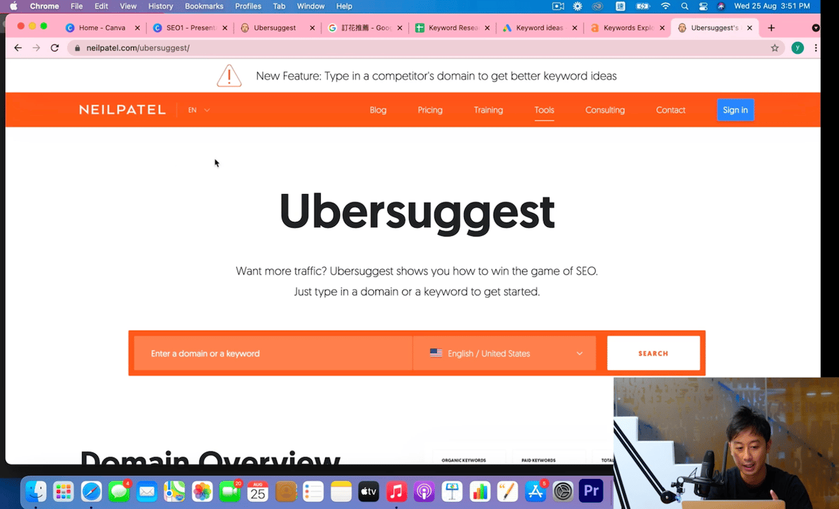 Ubersuggest是Neil Patel製造的一個軟件,SEO優化的工具之一。