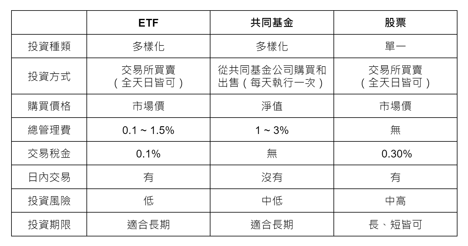 許多投資新手會將ETF與共同基金、股票搞混,或是不知道差別在哪?因此,我整理出ETF與共同基金、股票的差別圖表,來幫助你快速理解: