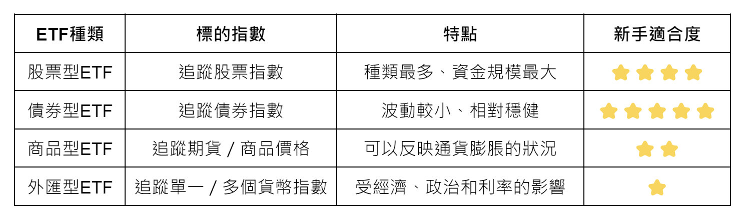 ETF入門須知的第2個重點,就是了解ETF種類有哪些?以下將分別介紹4種常見的ETF種類:股票型ETF、債券型ETF、商品型ETF、外匯型ETF。