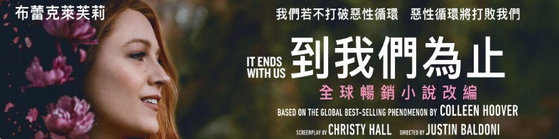 2024 年8月23日 ~ 8月25日 本週五六日在台搶先口碑場,下週五8月30日正式上映的美國電影《到我們為止》(It Ends with Us ) ,由索尼影業(Sony Pictures)發行,電影改編自科琳 · 胡佛( Colleen Hoover) 2016 年的同名小說。由《愛上觸不到的你》賈斯汀 ·巴爾多尼(Justin Baldoni)執導並出演男主角,克里斯蒂 · 霍爾( Christy Hall)編劇,《花邊教主》布雷克 · 萊弗利( Blake Lively)、賈斯汀 · 巴爾多尼(Justin Baldoni)、《西方極樂園》布蘭登·斯克萊納(Brandon Sklenar)、珍妮·斯蕾特( Jenny Slate)和哈桑·明哈吉(Hasan Minhaj)領銜主演。